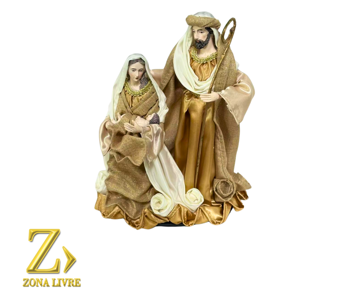 Transforme sua decoração natalina com a Sagrada Família Branco/Dourado 30cm, uma peça que transmite paz, beleza e significado. Ideal para quem valoriza o verdadeiro espírito do Natal.